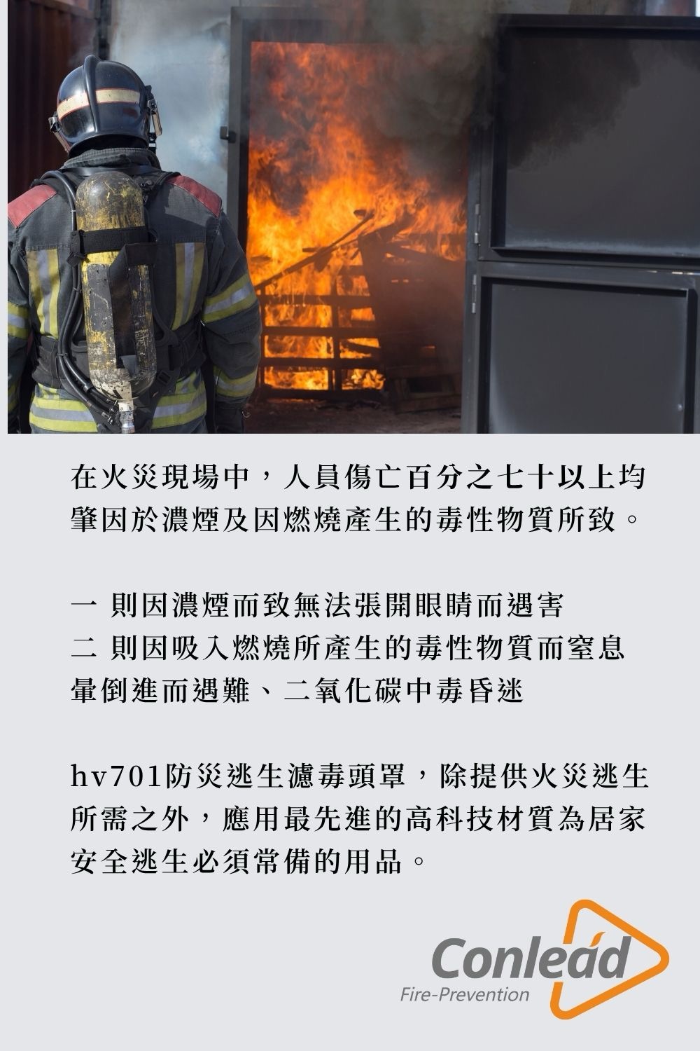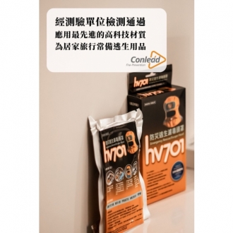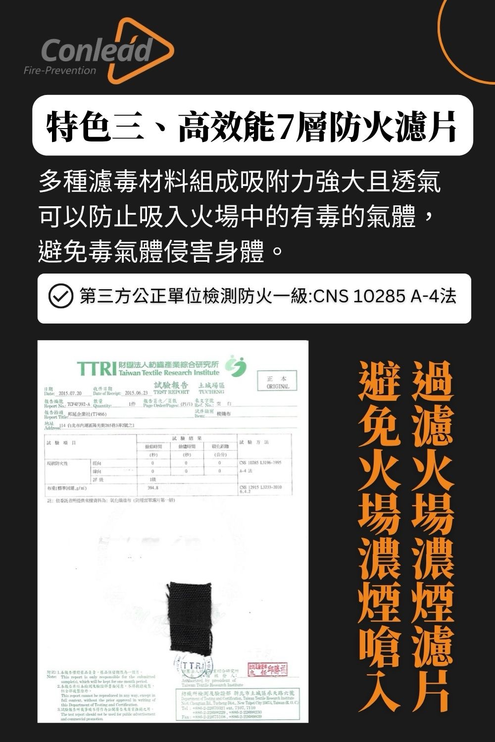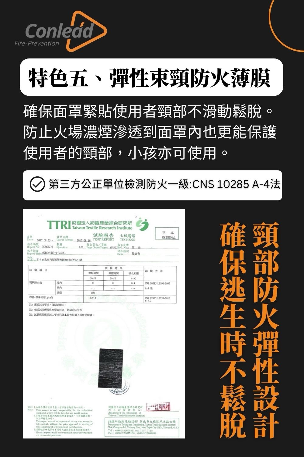 E.彈性頸部:束於頸部,阻絕濃煙及毒氣。其材料為耐火橡膠彈性薄膜,適用於各年齡層,經美國UL測試符合UL94V-0規範。