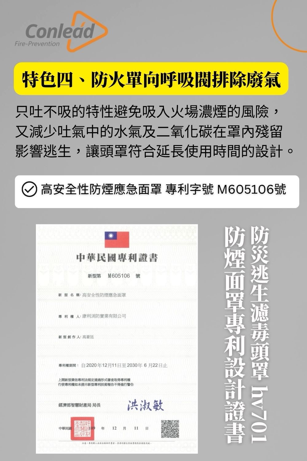 C.濃煙及毒氣濾片口罩:此獲得中華民國專利立體杯型濾片口罩(專利證號:第一四六八八六),可緊密貼合於口鼻部位,此濾片組共包含七層,由各種高科技吸附材料組合成複式濾片組,濾毒功能強大。